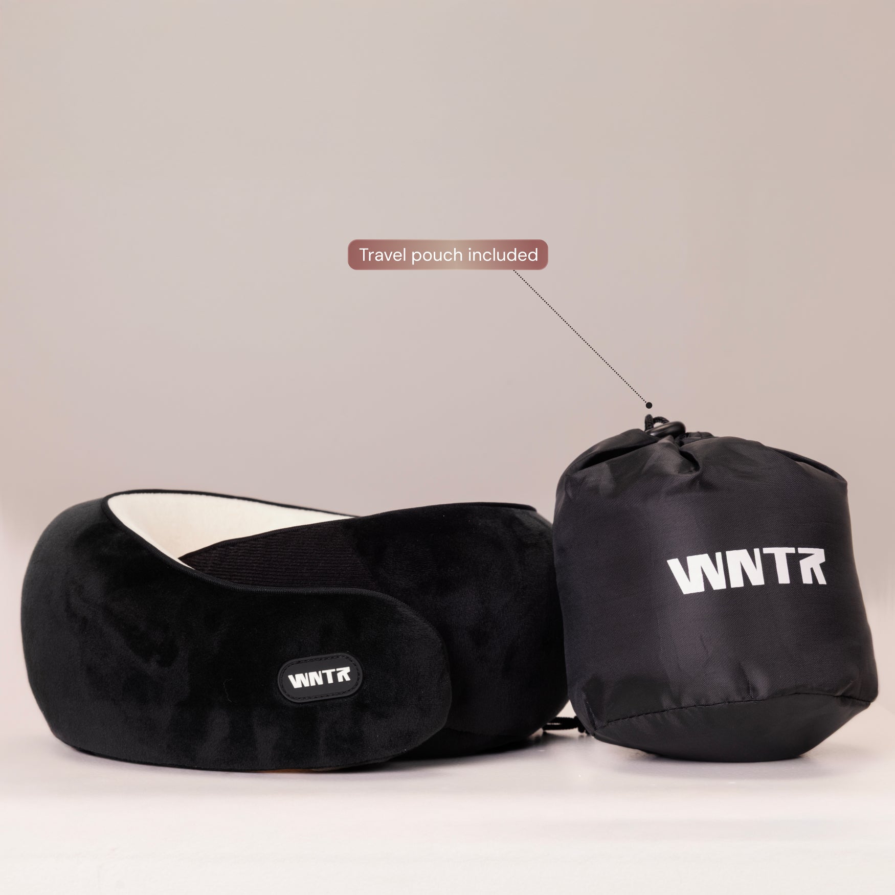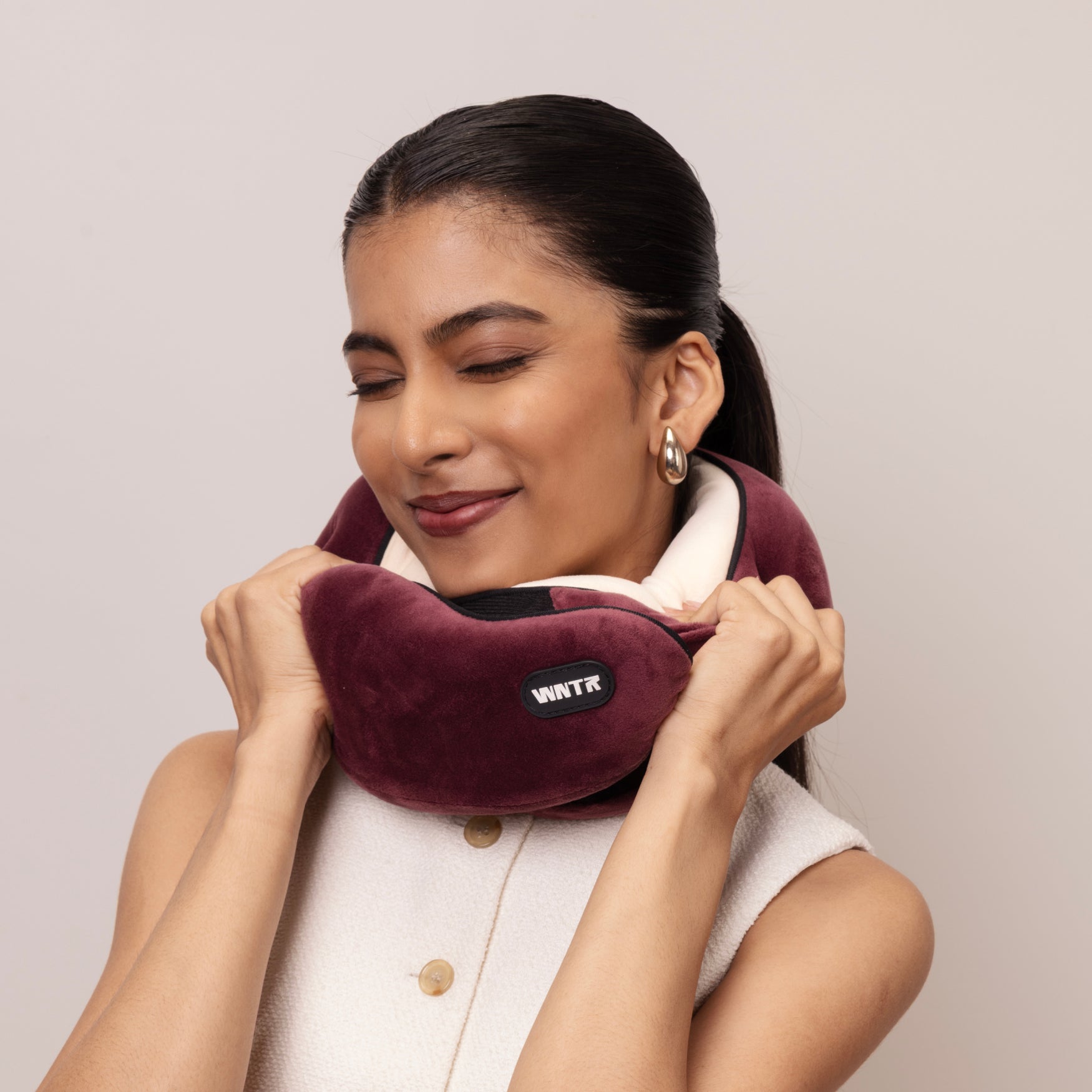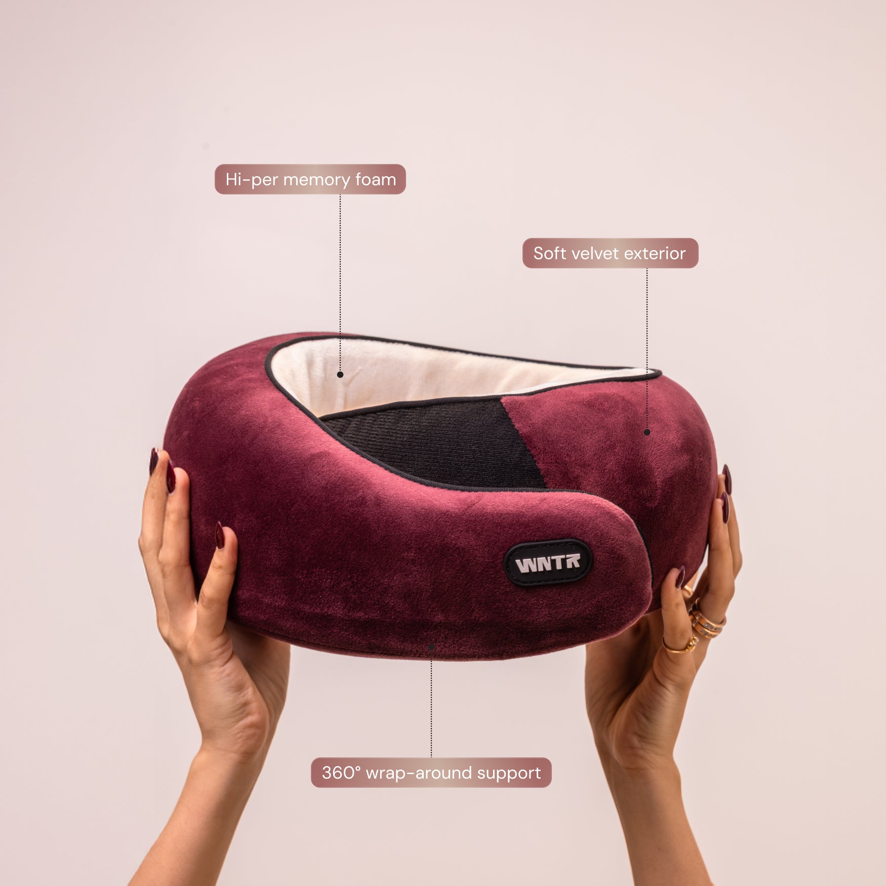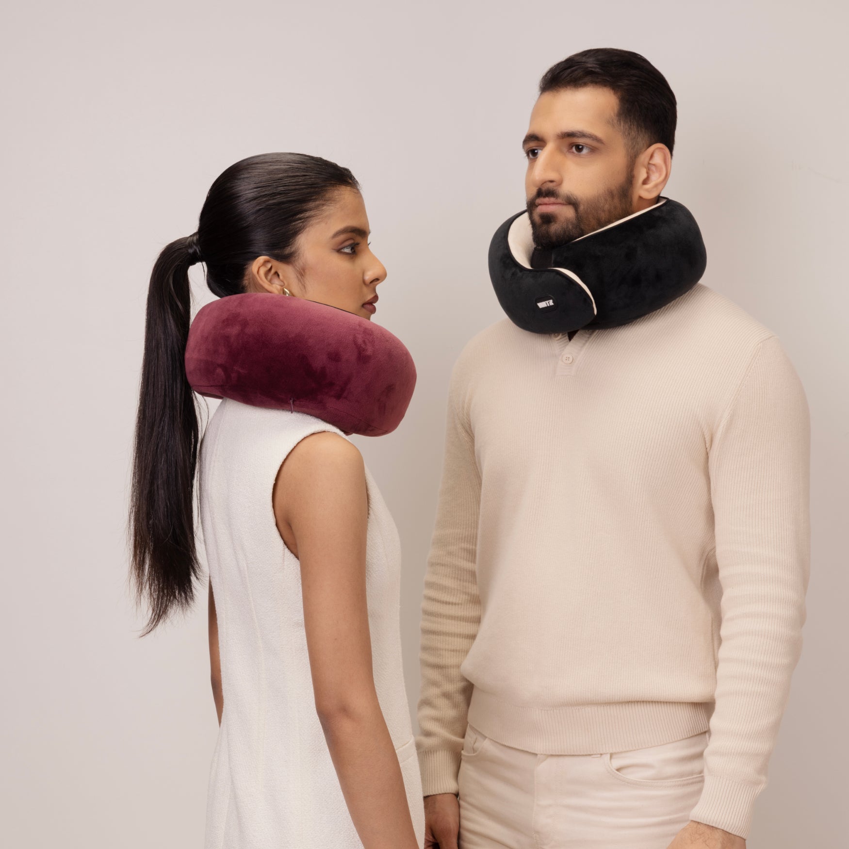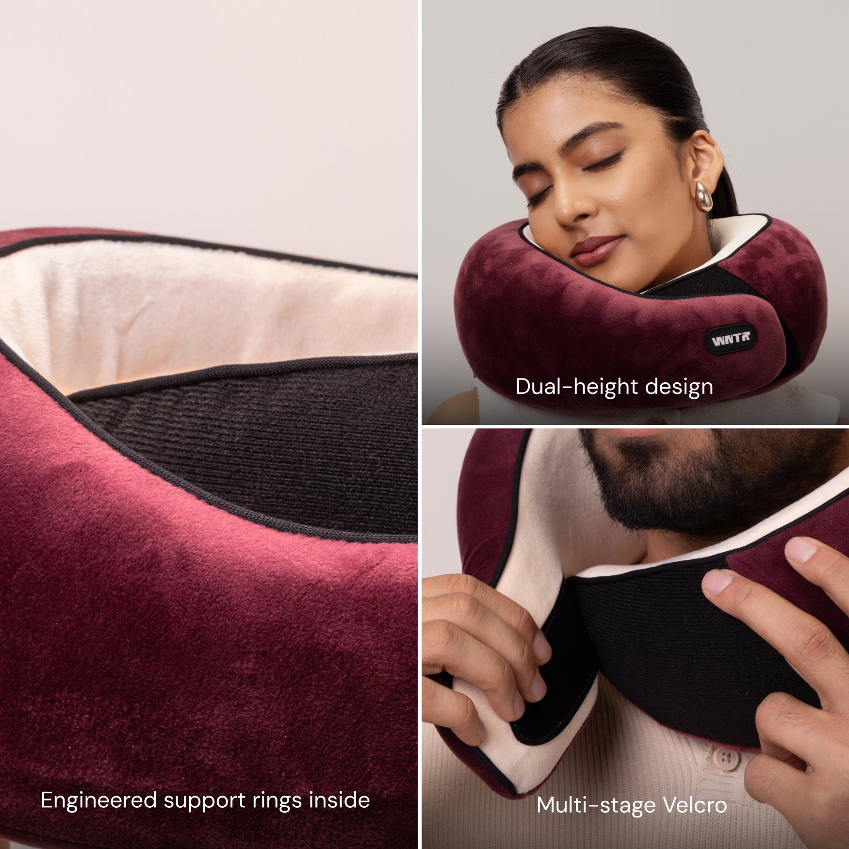 while maintaining shape. Premium velvet exterior stays cool and breathable. Multi-stage Velcro ensures perfect fit for any neck size. Includes compact travel pouch for easy